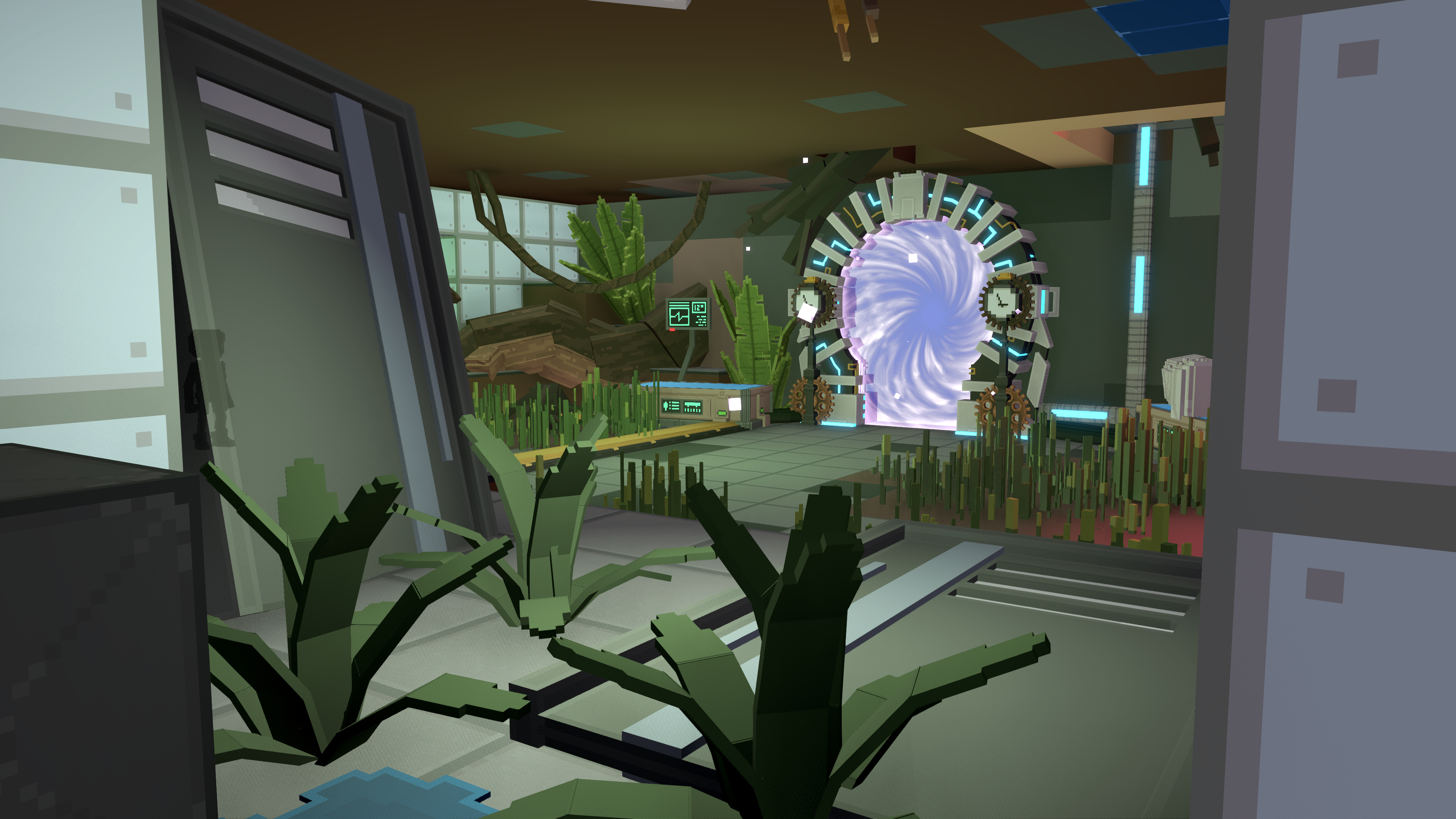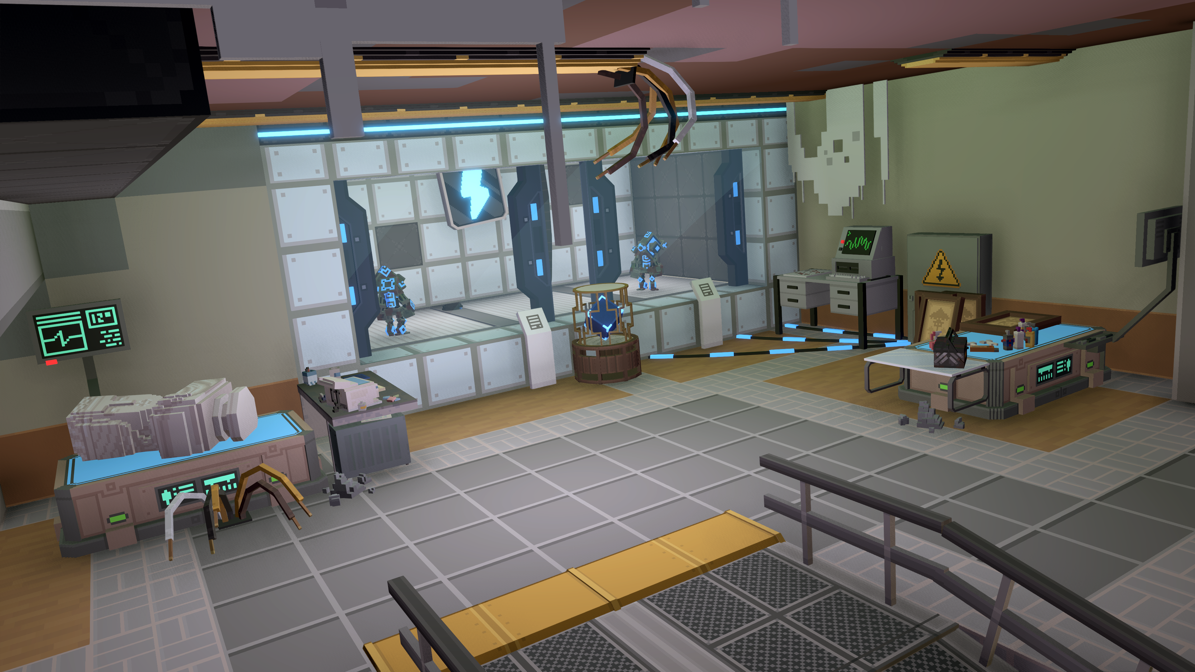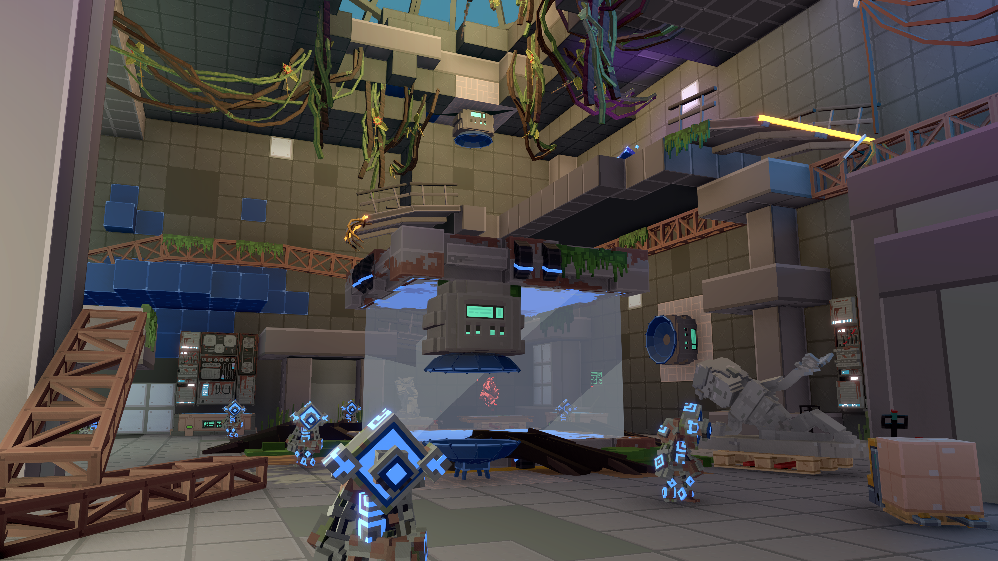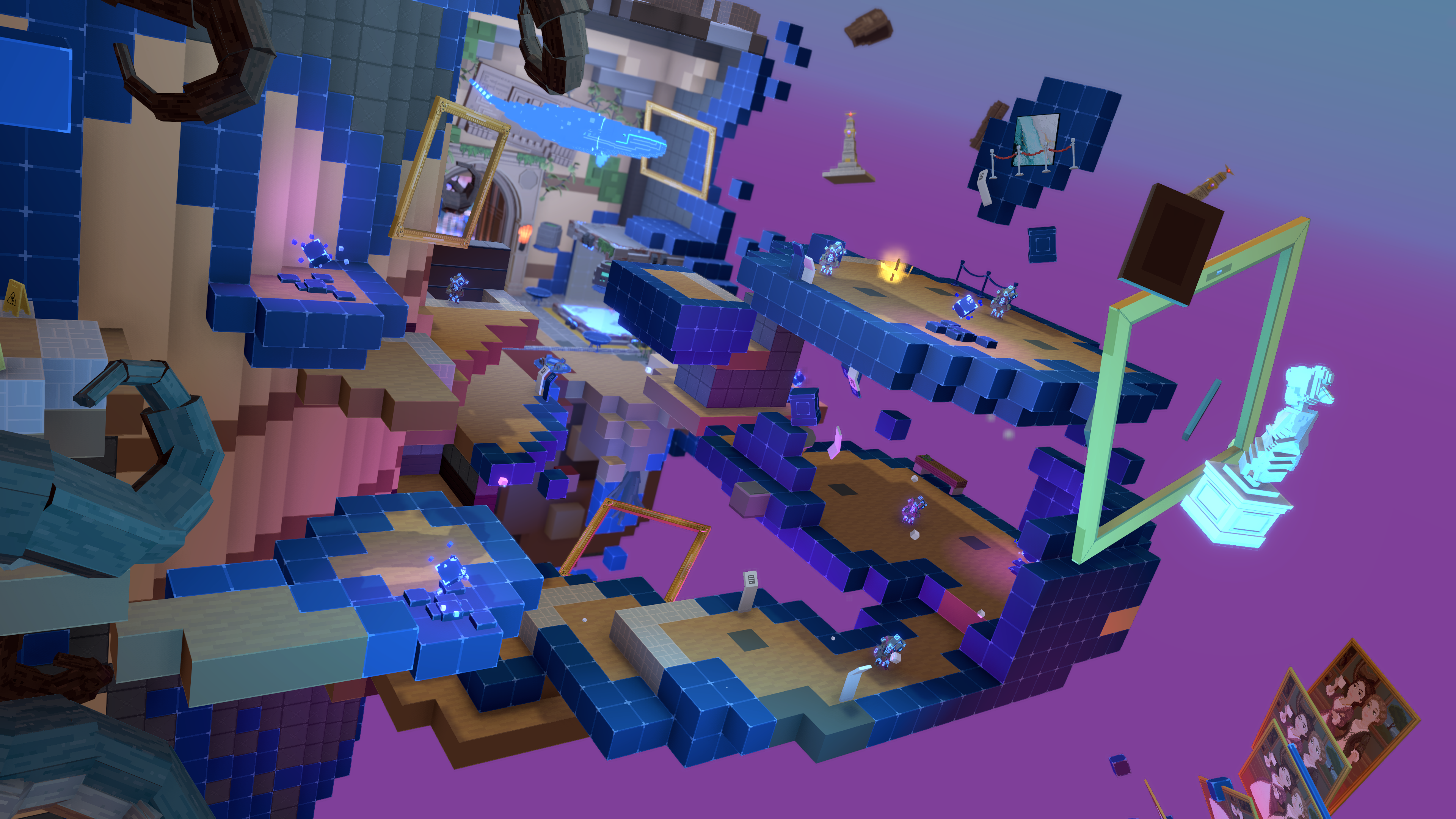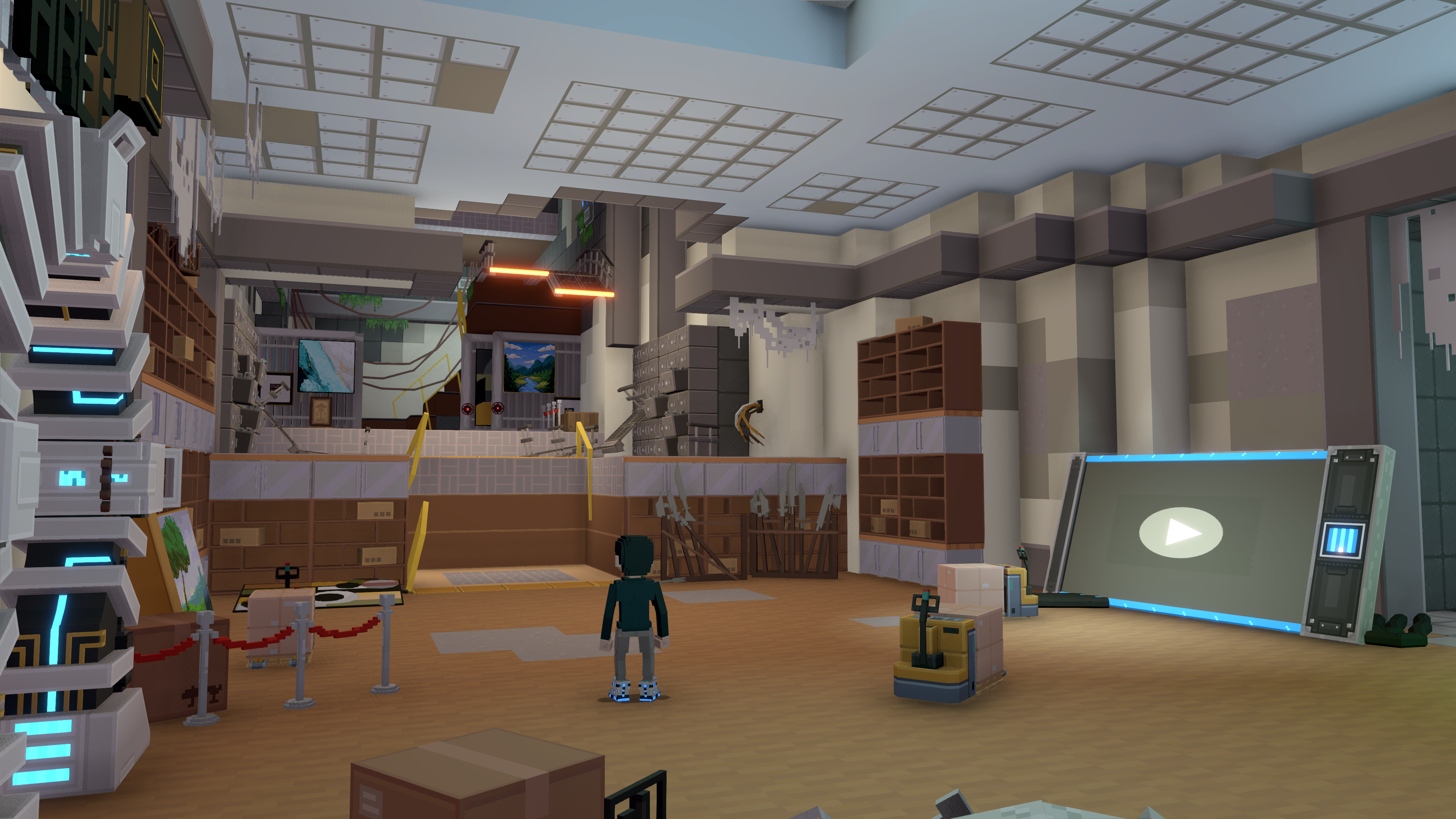 Environmental storytelling reinforces this escalation: the level begins in a quiet museum, gradually revealing a strange laboratory filled with portals and robots, before culminating in a reality-breaking confrontation with a giant attacking robot.